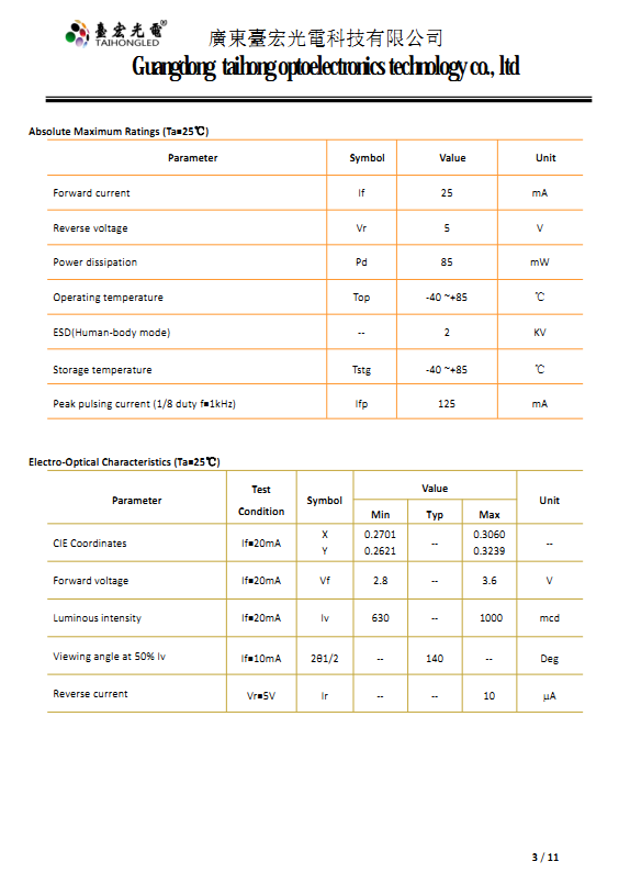 - 红色/绿色:50~300 mcd(常规款)、5~15 mcd(高亮度款);