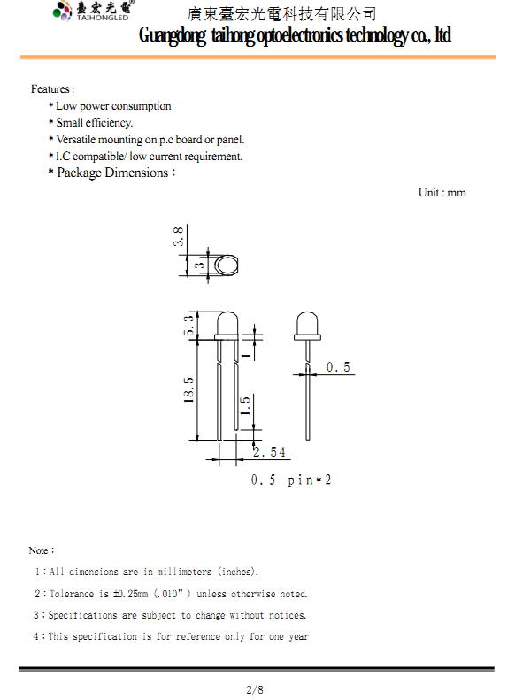 台宏3mm白光插件灯珠尺寸图: