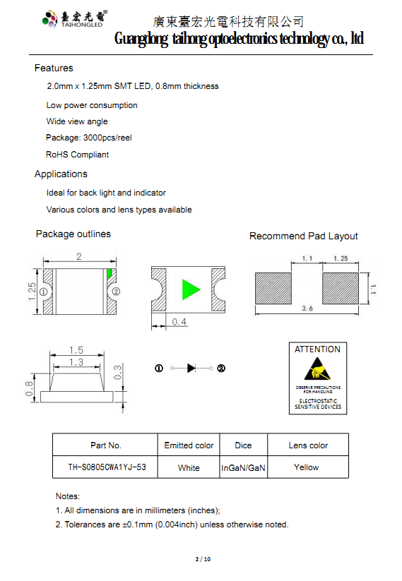 灯珠规格型号:TH-S0805CWA1YJ-53