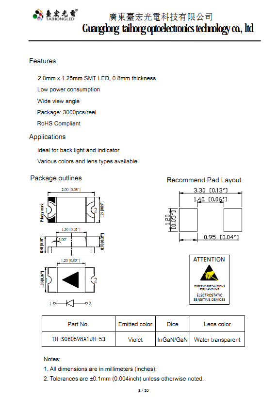 更多的0805紫光,绿光,蓝光,白光和红外灯,0802侧发单色,双色,三色以及侧发全彩系列灯珠规格书,样品测试请咨询台宏客服工程师微信 2881795059