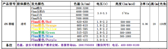 Ø5 草帽 | 透明 | F5mm暖白 | 2800-3200 | 3.0-3.3 | 5~9lm | 0.06 | 20 | 120度 |